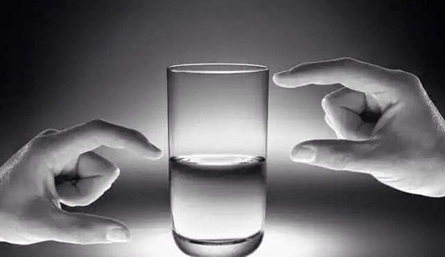A metáfora do copo diz que dependendo do ponto de vista, um copo pode estar meio cheio ou meio vazio. Tudo depende de como você interpreta a situação. Quem dá mais atenção à parte vazia, com o propósito de torná-la mais cheia, são os chamados otimistas! Já os que observam a mesma imagem, por um prisma diferente, se preocupando com o que falta para terminar ou quando olham a parte meio cheia e tanto faz como a água está, essas pessoas tendem a ser pessimistas.